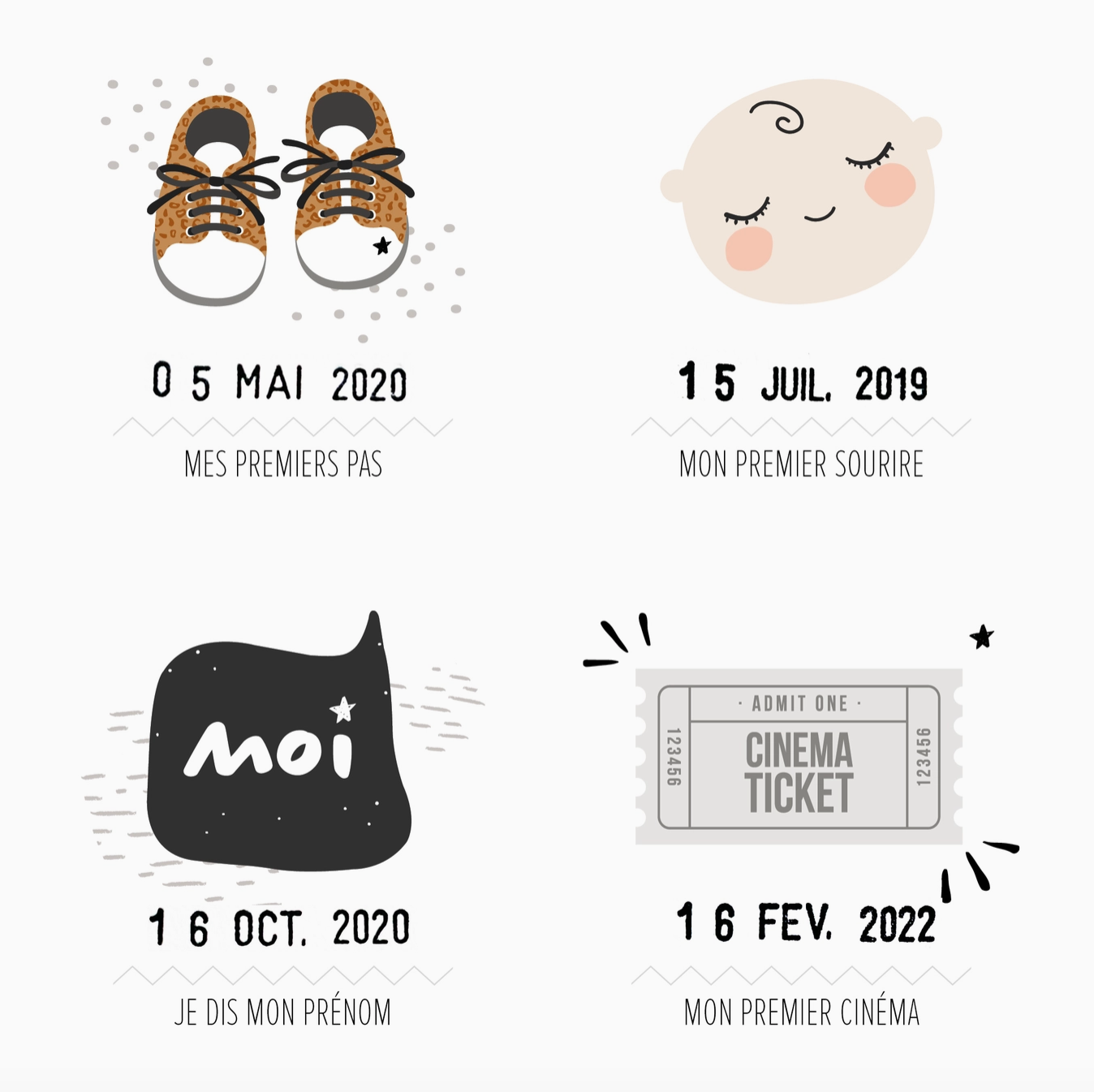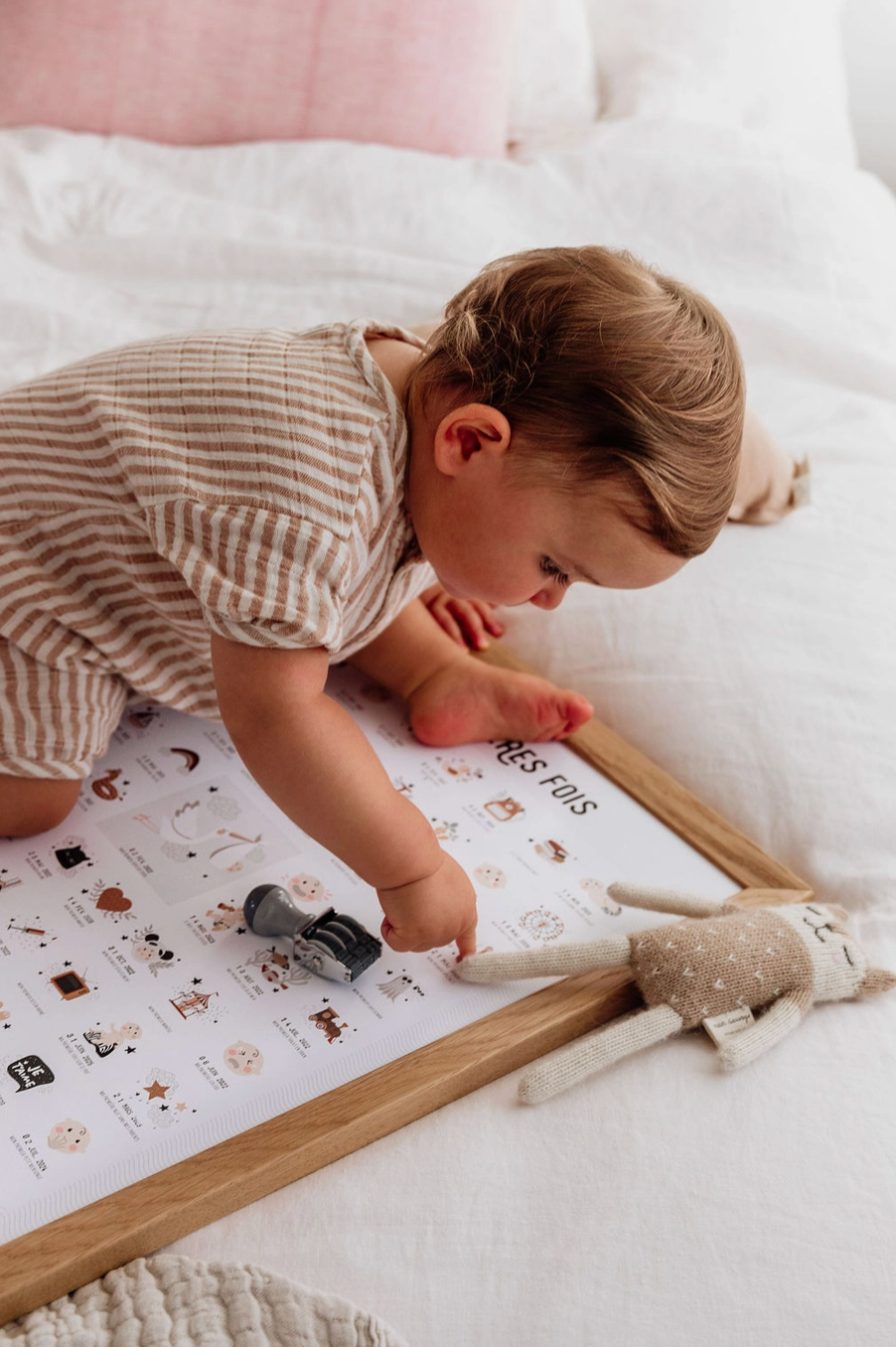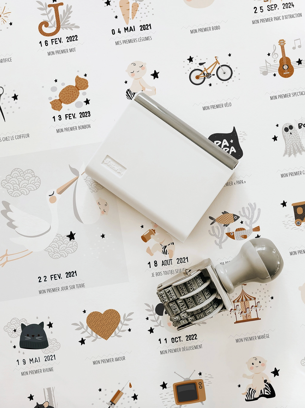 Avec l'affiche "Mes premières fois", nous avons désormais un moyen de marquer chaque nouvelle prouesse de notre enfant, grâce à un tampon dateur inclus et un encrier fourni.